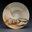 My work is wheel-thrown, cone 10, porcelain with original glazes. I layer the glazes to achieve the decorative abstract symbols, and encourage chrome-tin pink flushes to add richness to the color palette. The nude platters are drawn with “underglaze crayon” over various slips, then soda-fired to achieve the glossy surface and color flashing.