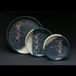 My work is wheel-thrown, cone 10, porcelain with original glazes. I layer the glazes to achieve the decorative abstract symbols, and encourage chrome-tin pink flushes to add richness to the color palette. The nude platters are drawn with “underglaze crayon” over various slips, then soda-fired to achieve the glossy surface and color flashing.